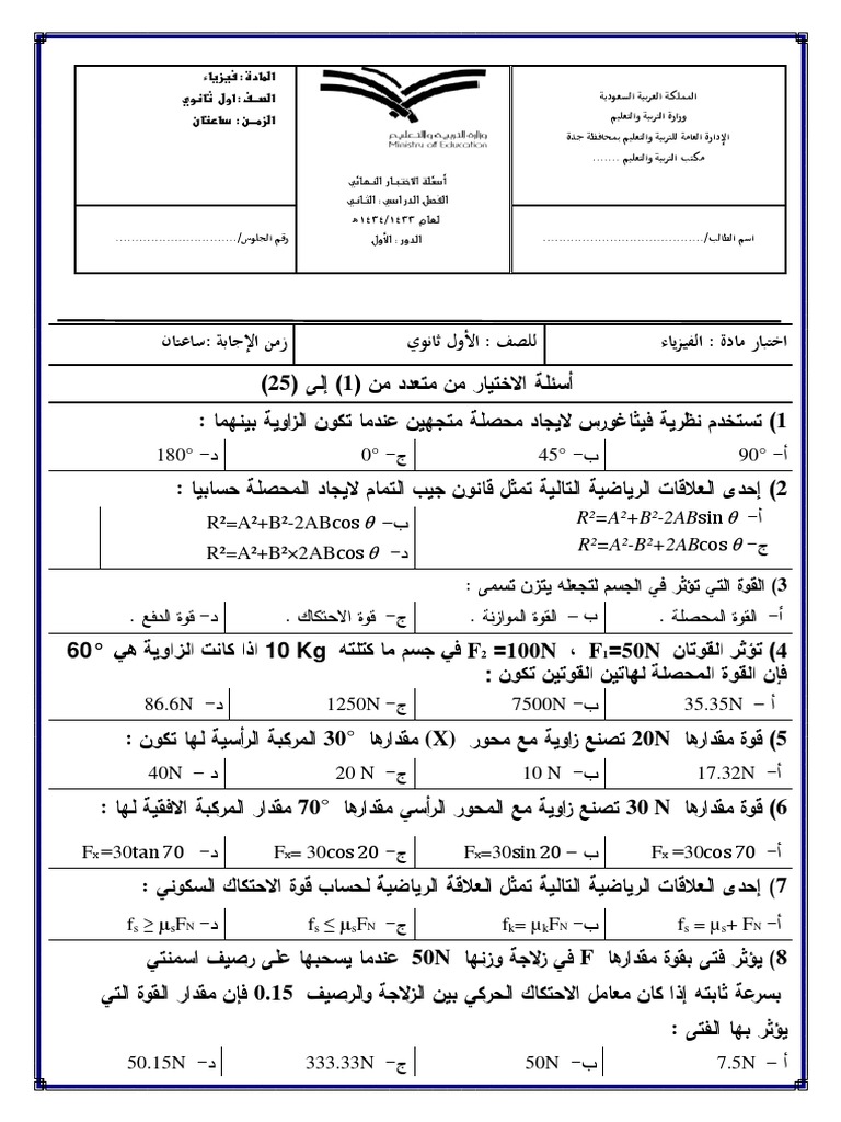 اسئلة اختبار فيزياء ثاني ثانوي الفصل الدراسي الاول نهائي لعام 1440 المساعد الشامل