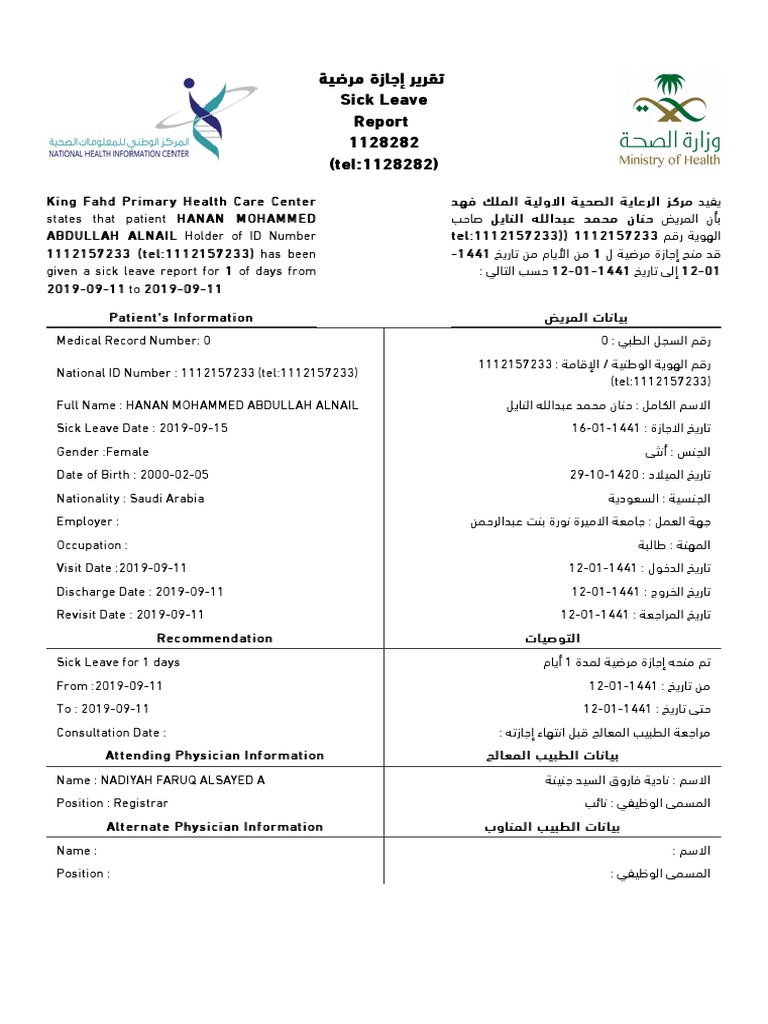 الرجاء ادخال رمز التحقق الذي تم ارساله الى رقم الهاتف أو البريد الالكتروني لاتمام العملية. منصة صحة الاجازات المرضية. ت عد منصة الإجازات المرضية إحدى الخدمات الإلكتروني ة التي ت قد مها وزارة الصحة بالمملكة العربي ة الس عودية وذلك عبر منصة صحة التابعة لها حيث ت تيح هذه الخدمة للمنشآت الص حي ة تسجيل.